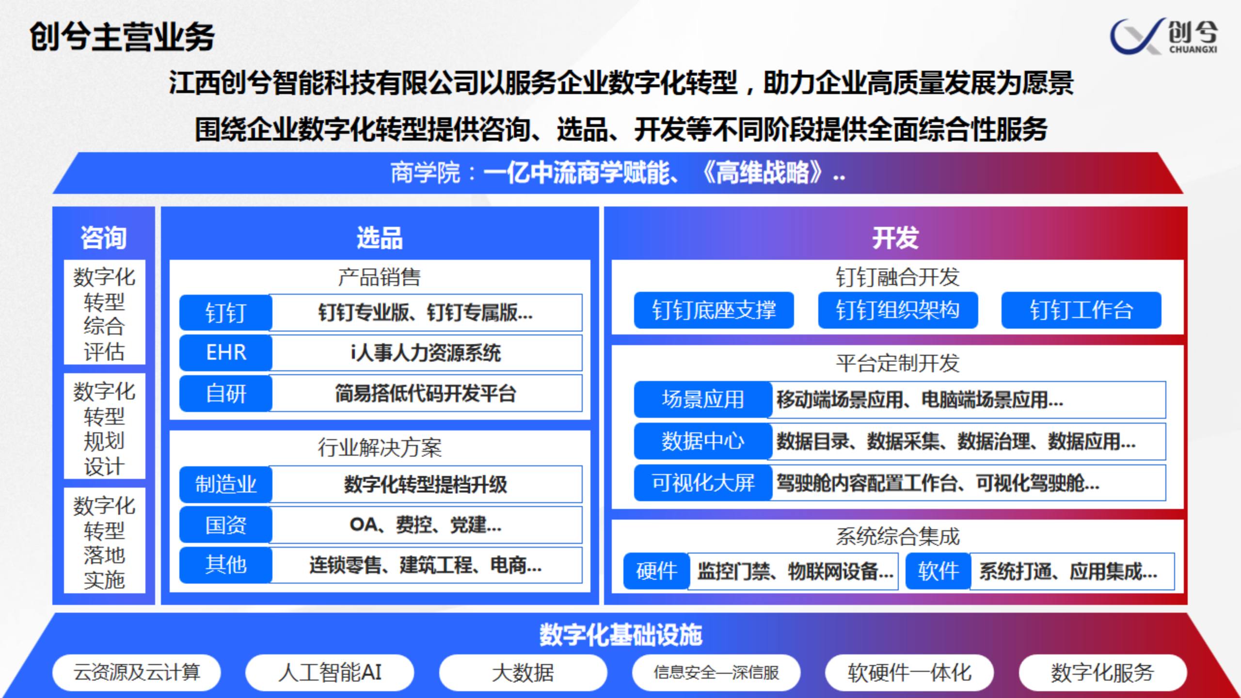 江西创兮智能科技有限公司成立于2018年,是一家专门从事企业信息化服务、云计算和大数据服务、企业服务定制及企业办公物联网的互联网服务商,致力于为客户提供集咨询、开发、集成、服务为一体的专业信息化服务。公司将企业数字化、物联网、云计算、大数据分析、人工智能技术同产业运营相融合,为客户提供优秀的企业信息化服务解决方案,助推中国企业完成数字化转型。
