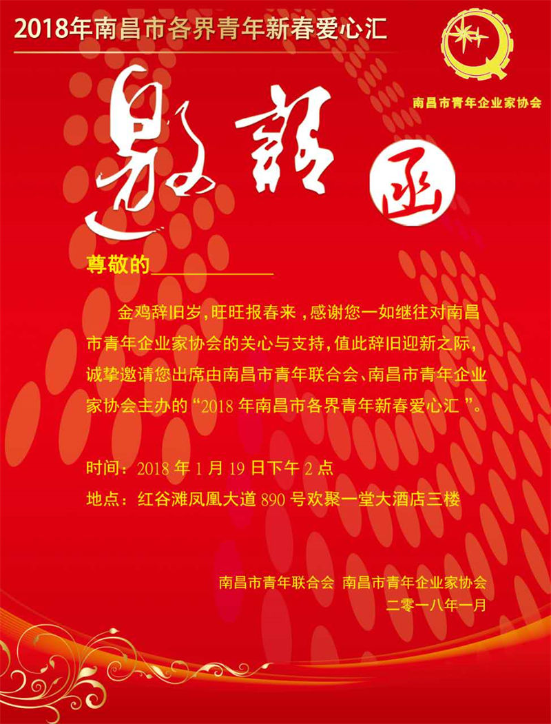 通知:由市青联、市青企协联合举办的2018全市青年新春公益汇将于1月19日下午两点在红谷滩欢聚一堂举行,将为大家准备丰富的礼品、奖品及美轮美奂的迎新节目,请各位会员提前安排好时间共同迎接这美好时刻!如有意向冠名或赞助的企业可与秘书处联系:83885808、83885260