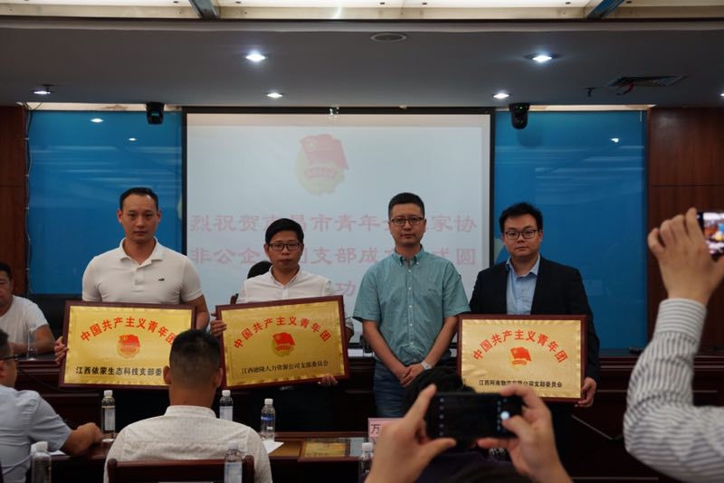 会上,全体肃立,奏唱国歌。会长揭建刚分别为“南昌市德隆人力资源有限公司团支部”、“江西依蒙生态科技有限公司团支部”、“江西阿南物流有限公司团支部”授予铜牌。