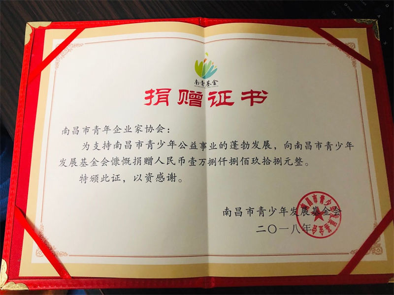 2018年,在继“血的真情,爱的飞扬”公益献血、“迎重阳、传三风、送温暖”、冬暖太阳村等各项公益举动之后,11月20日,为支持南昌市青少年公益事业的发展,让更多身处困境中的青少年实现上学梦,2018“创新、创业、创优”人物评选活动中涌现出的优秀候选人,不忘初心,奉献爱心,向南昌市青少年发展基金会慷慨捐赠,切实帮助城乡困难青少年解决生活、工作、学习中遇到的困难和问题。