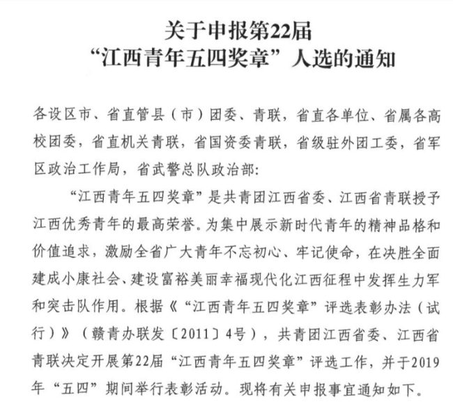 《关于申报第22届“江西青年五四奖章”人选的通知》