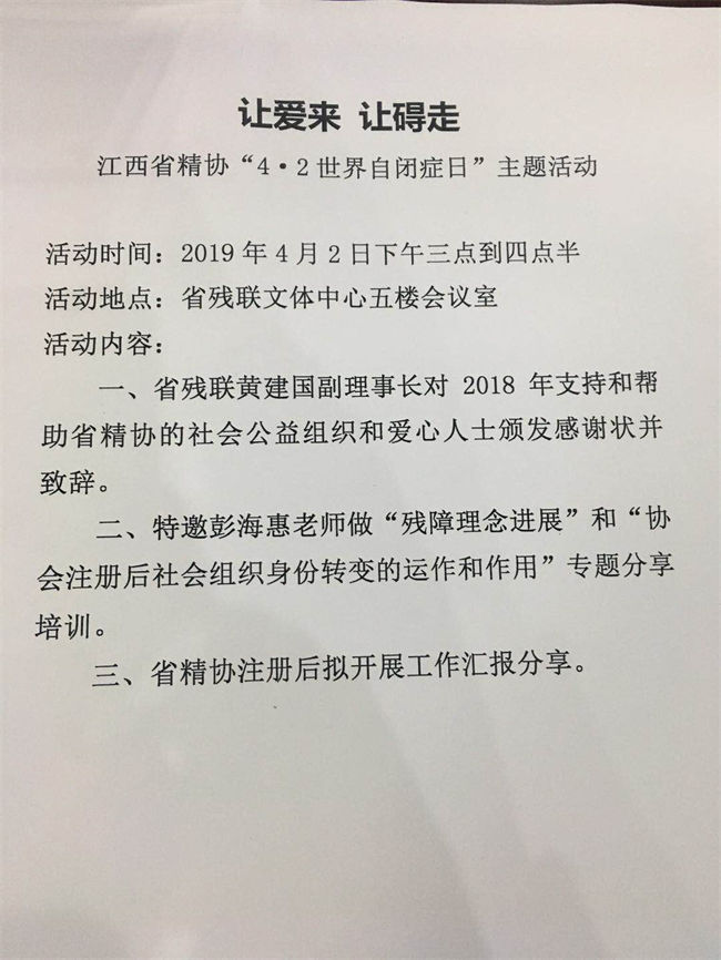 4月2日是“世界自闭症日”,是全社会精神残疾朋友们的重大节日。由江西省精神残疾人及亲友BB贝博艾弗森官方网站(以下简称省精协)主办的“让爱来 让碍走”主题活动在省残联文体中心五楼会议室举行,南昌市青年企业家BB贝博艾弗森官方网站作为受邀单位出席。会上,由省残联副理事长黄建国代表省残联党组理事会,为2018年支持和帮助省精协的南昌市青年企业家BB贝博艾弗森官方网站等社会组织及爱心人士颁发感谢状。由公益界著名彭海惠老师做“残障理念进展”和“协注册后社会组织身份转变的运作和作用”专题分享培训,活动在交流分享,强烈反响的氛围中圆满举办!