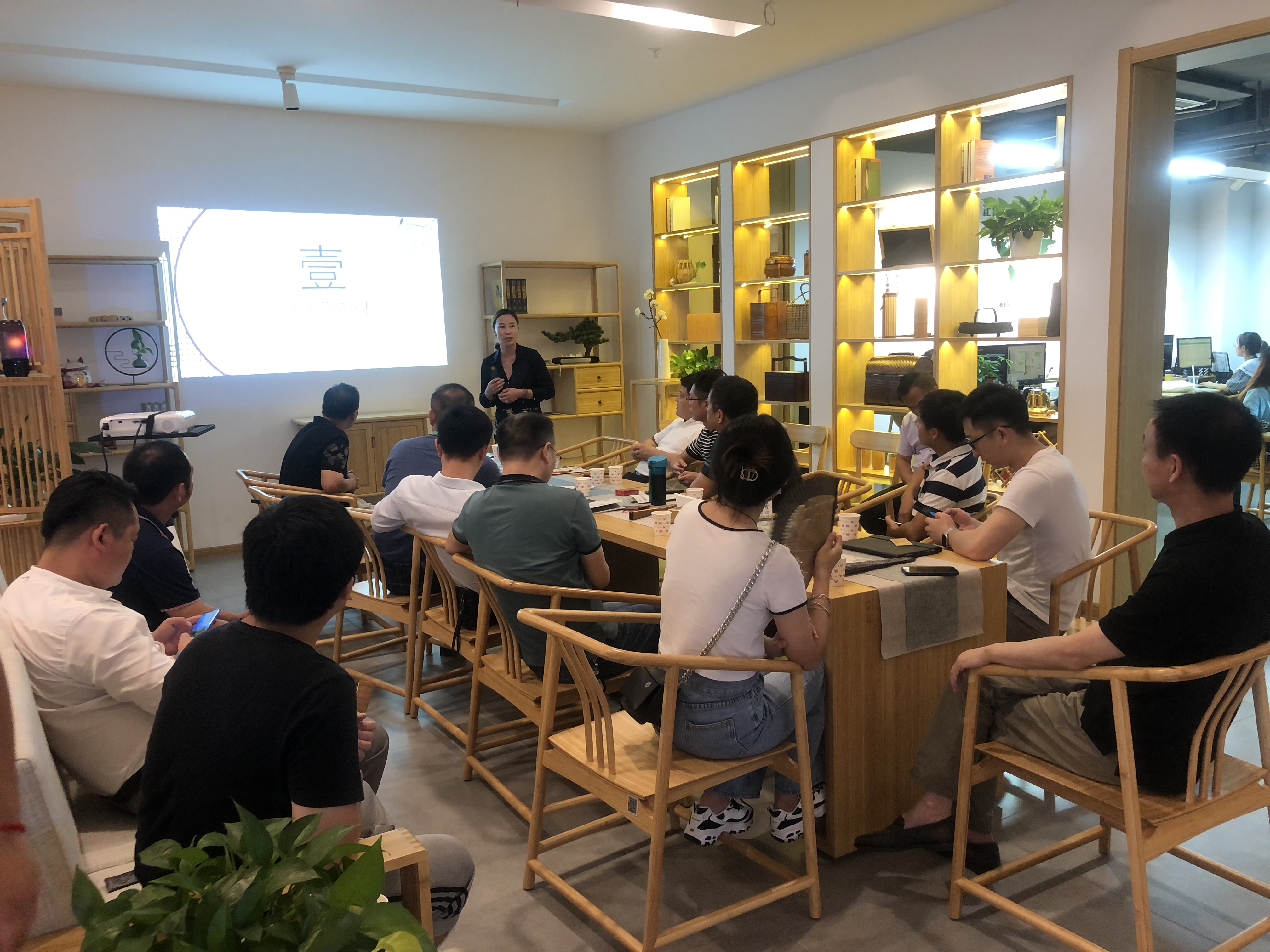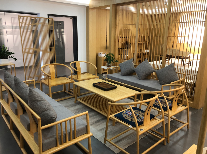 在走访过程中,朱磊用互联网思维给大家上了一堂生动且感触颇深的分享课。并带领大家参观了公司的竹制样品,同时讲解了竹制家居制作流程。让会员家人们欣赏到许多名贵的工艺品。面对众多精湛工艺的竹制茶桌,青云分会导师团成员袁伟珍为大家分享了一些关于《企业办公室茶文化和礼仪》,会员家人们听的津津有味。