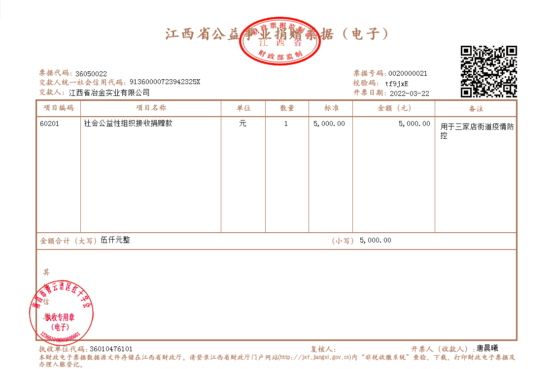 3月22日,BB贝博艾弗森官方网站会员单位、江西省冶金实业有限公司捐赠5千元用于三家店街道疫情防控。